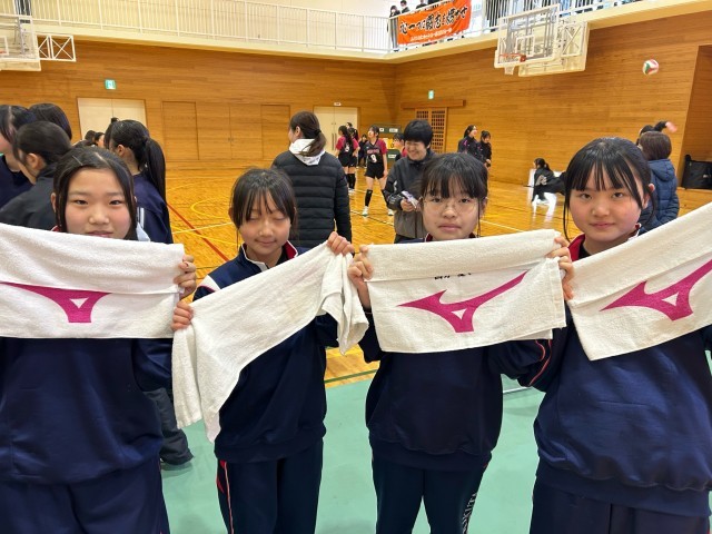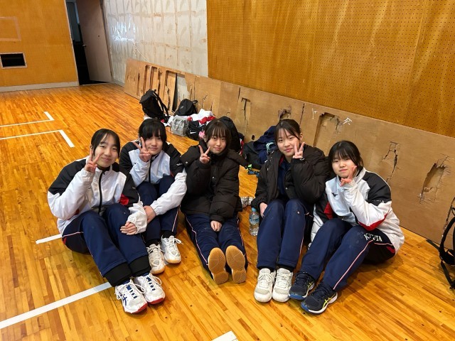 本校、体育館でバレーボールの1年生大会が行われています。4人の1年生と2年生が力を合わせて頑張っています。一回戦、突破しました。おめでとうございます。