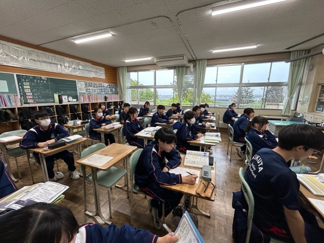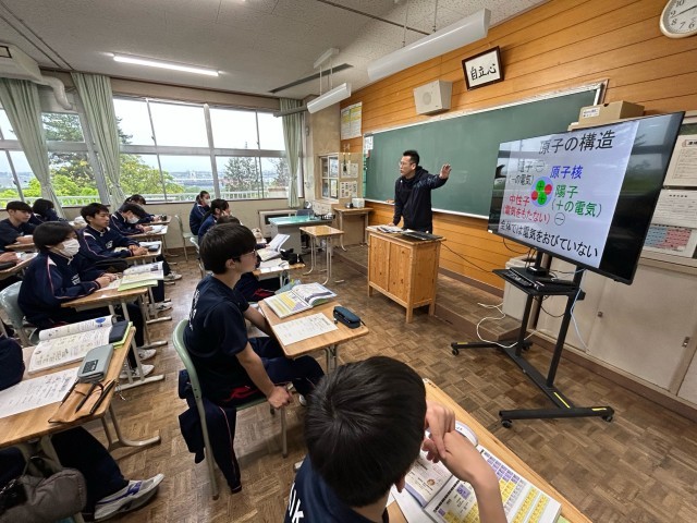 3年生は理科で原子の構造を学習しています。原子は物質を作る最小の粒子です。その小さな粒子の中に陽子、中性子、電子が存在しています。化学の中で重要な事柄を今日の授業で確認しました。