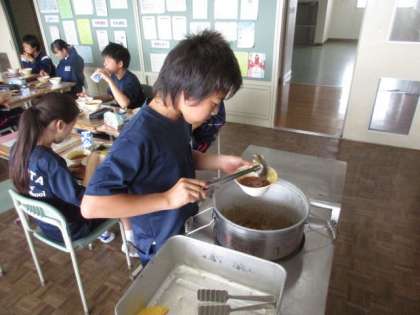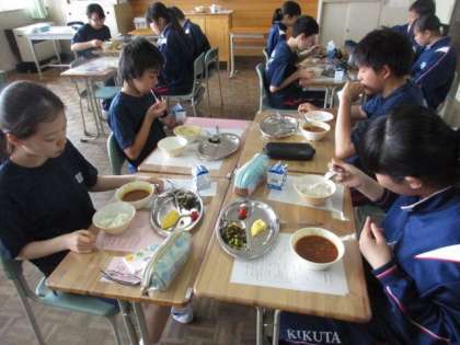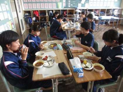 中学校の給食、ぺろりと平らげます。野菜もトマトも好き嫌い無く食べていました。おかわり!