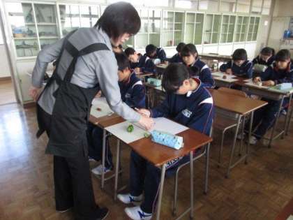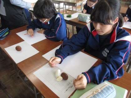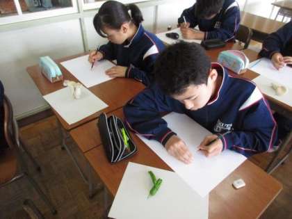 タマネギ、ピーマン、シメジに椎茸。自分のお気に入りを選んでデッサンをしています。ごつごつ感、ふにゃふにゃ感でるかな?