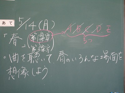 音楽を聴いて場面を想像しましょう。「春」を鑑賞しました。「蜂が人間にビックリして花粉を落として飛んでいった。」素晴らしい発想ですね!