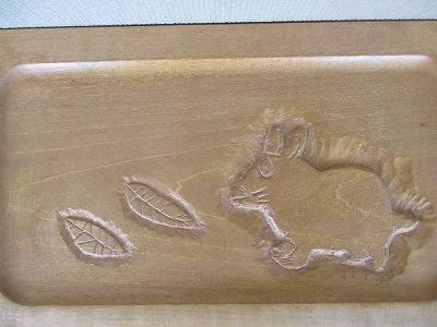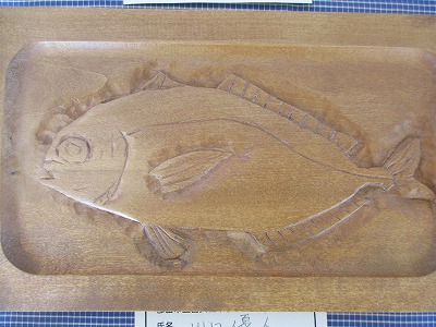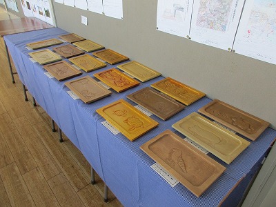 1年生の作品が展示されています。大好きな物を彫りました。想いが伝わる作品ですね!