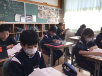 2年生の家庭科では布の繊維の種類と特徴を学習しました。化学繊維、綿、麻などそれぞれの種類の名前と特徴を表にまとめながら覚えました。知識が豊富な2年生は絹は高価で光沢があるなど教師の発問にしっかり答えることができていました。