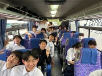 いよいよ修学旅行です。喜久田スポーツ広場駐車場で修学旅行出発式を行いました。生徒...