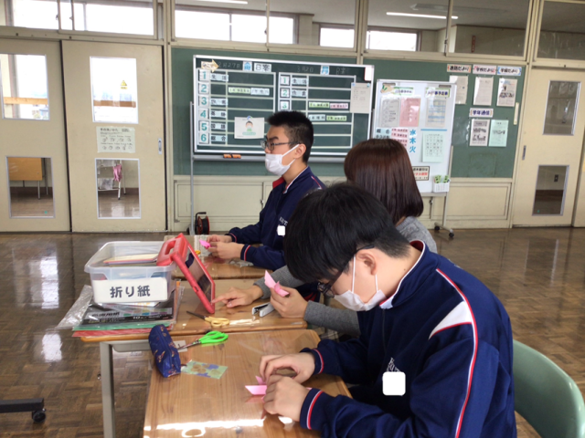 あおぞら学級では卒業生に贈るプレゼントの作製を行っています。今日の作業の時間は折...