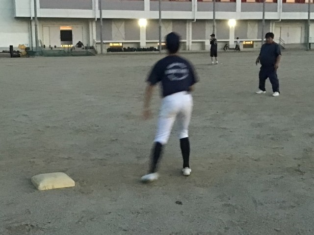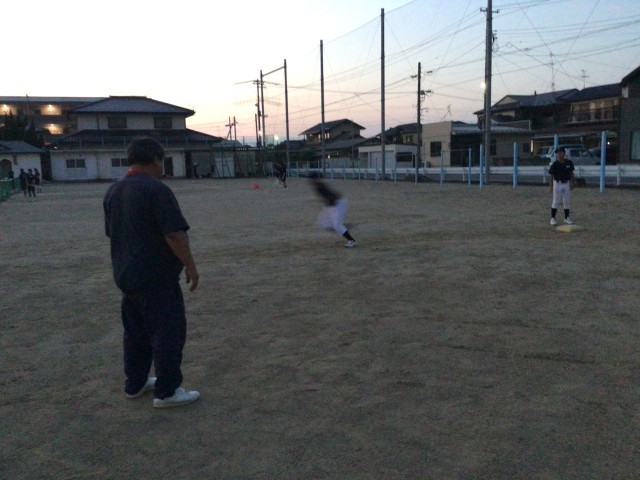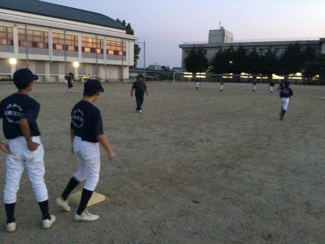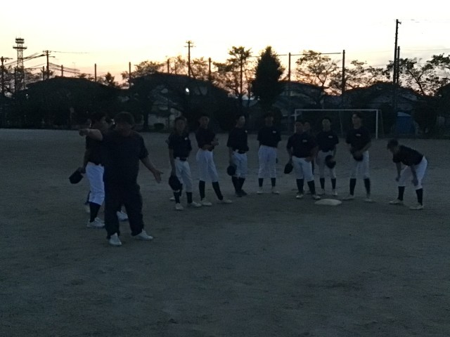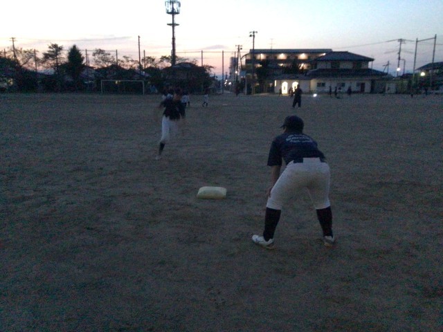 練習試合の反省から。暗くなってきたので走塁練習。ピッチャーの動きに合わせてリード。ソフトボールにはない動きなので繰り返し練習!