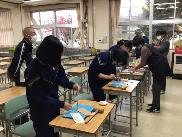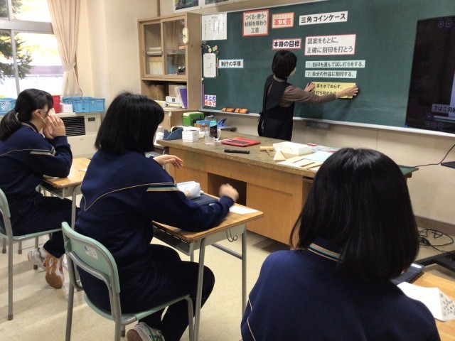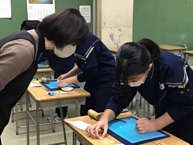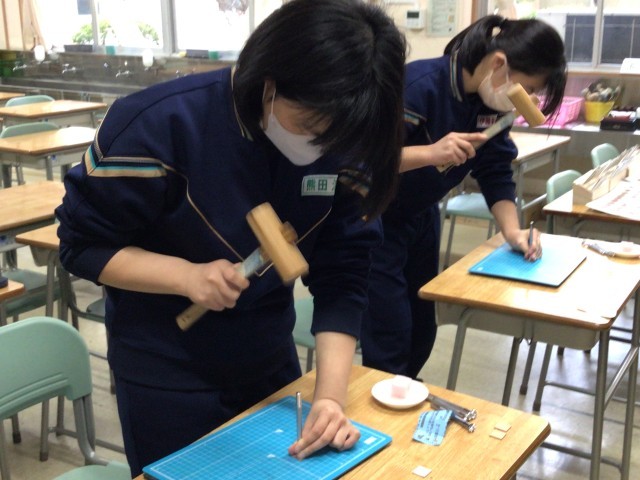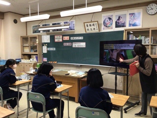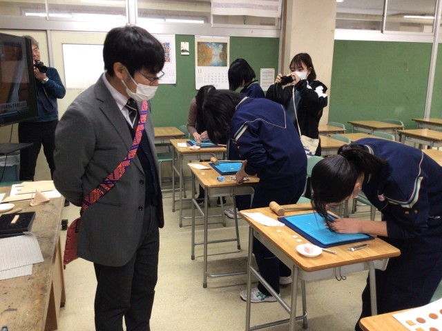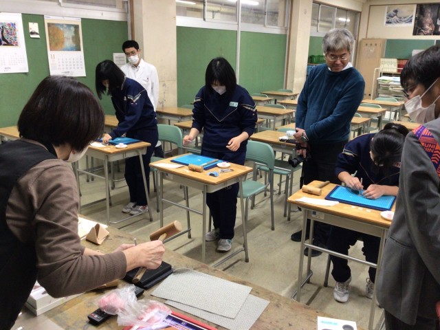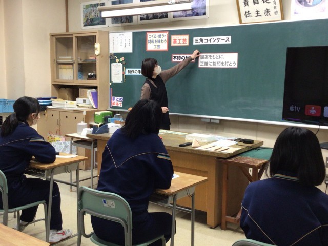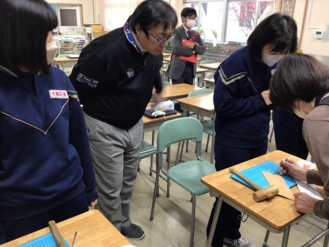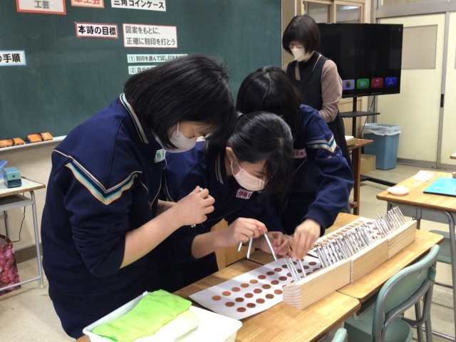 革細工、三角コインケースに挑戦!研究授業で先生方観てますね。緊張?