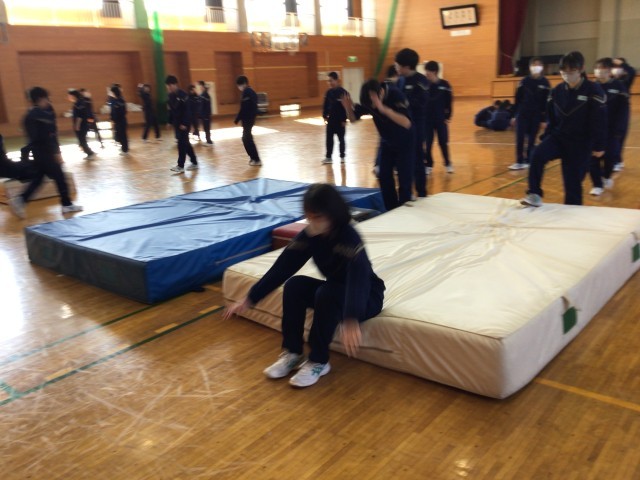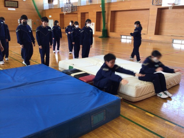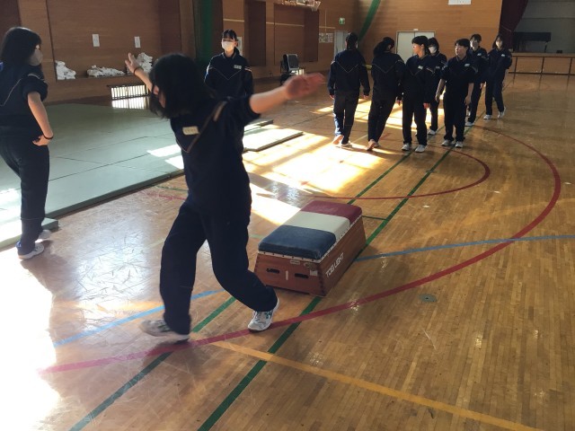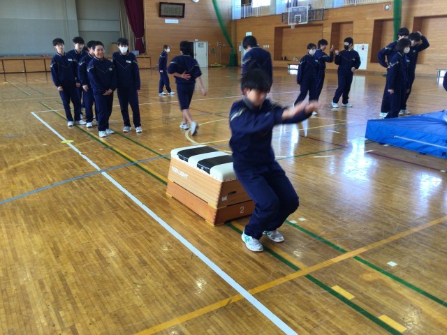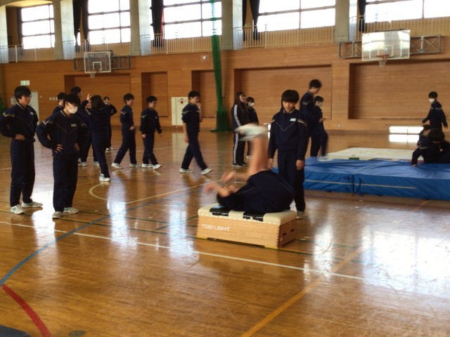 跳び箱上で前転。段階を追って練習です。
