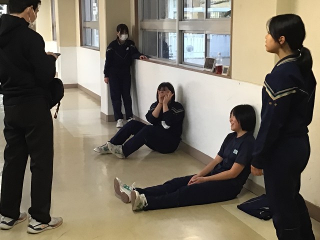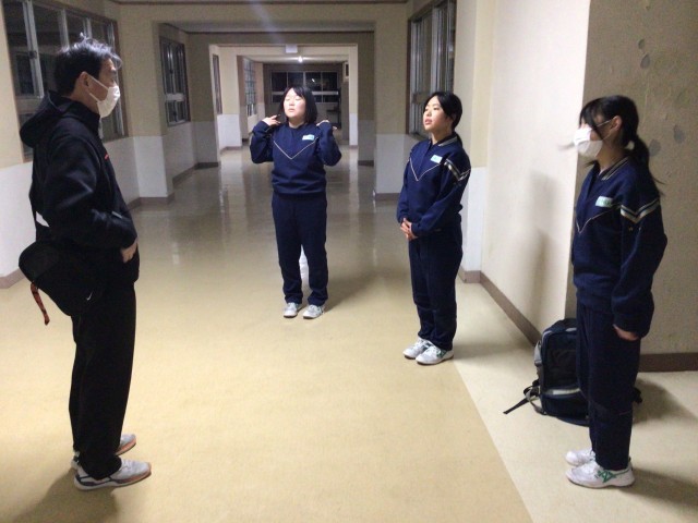 廊下でトレーニング!明日は宮城中で合同練習です。