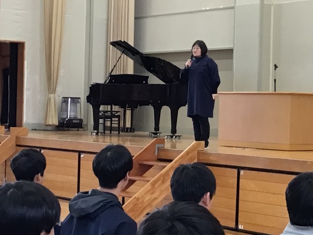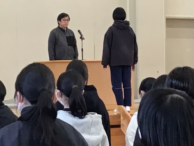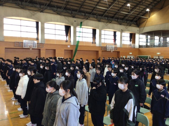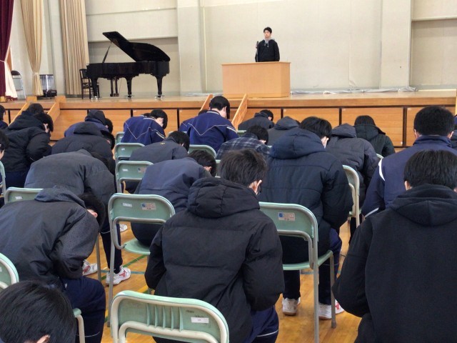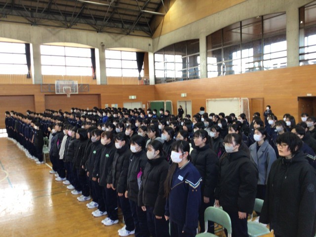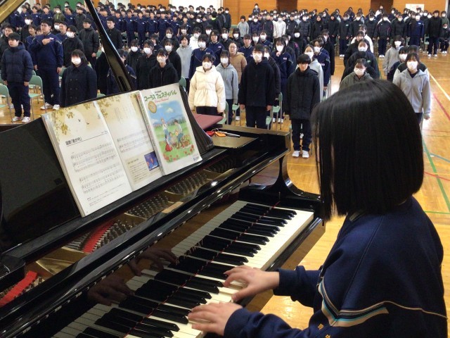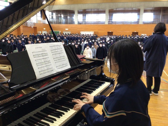 礼のタイミングを確認。拍手は細かく!卒業生、在校生、一同、指示を聞き分けて。式歌の練習、伴奏と合わせて!