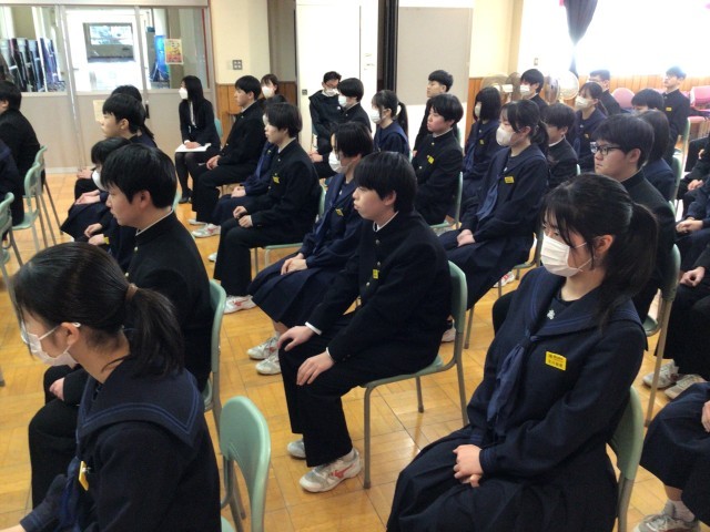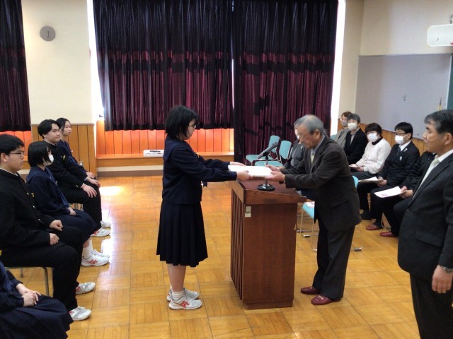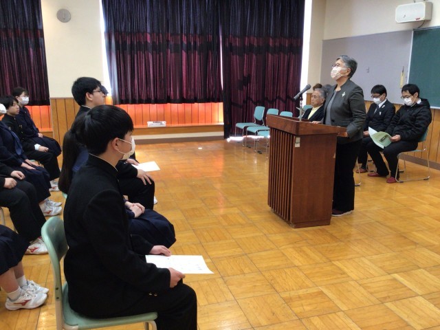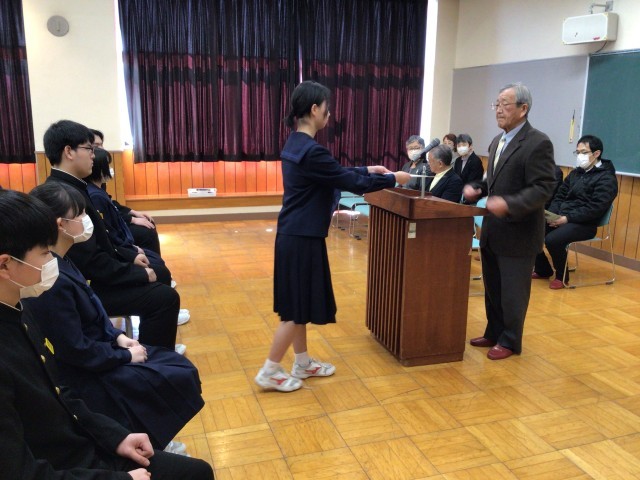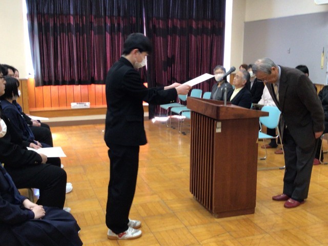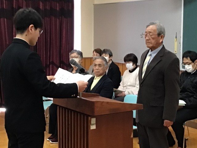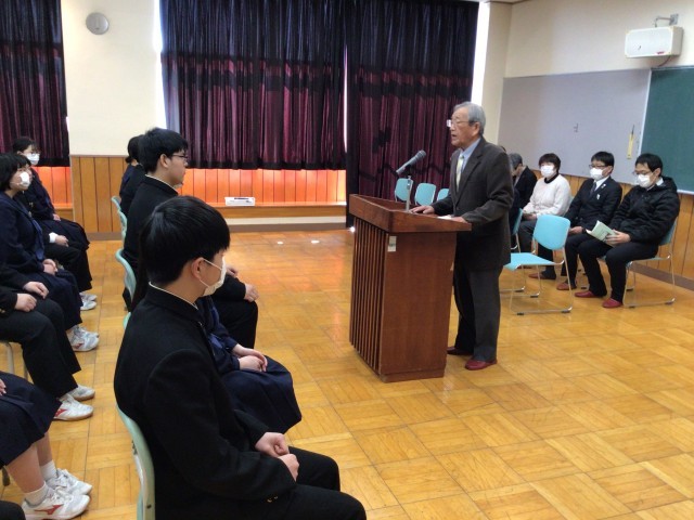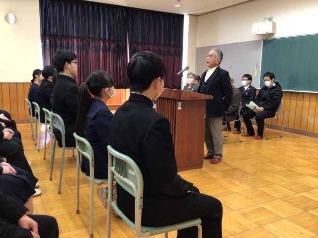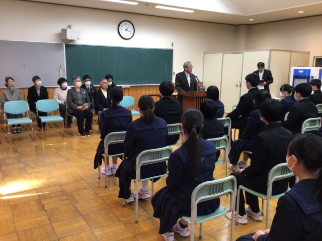 当時はひと学級54人!同窓会副会長のお話。記念品として卒業証書フォルダが贈られました。