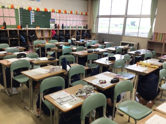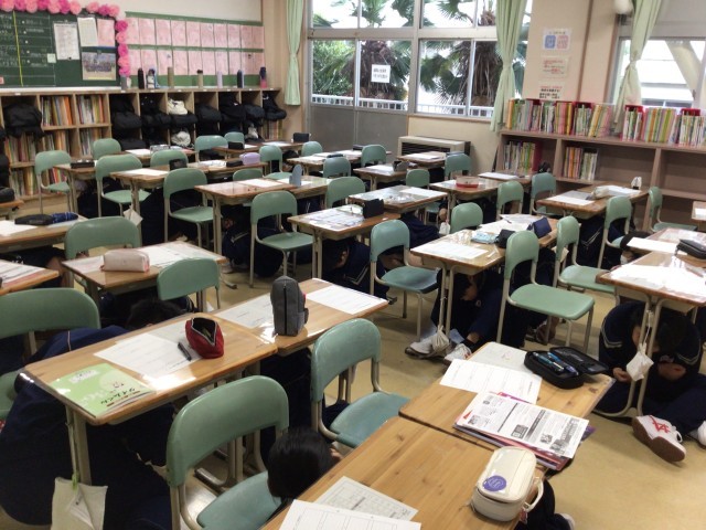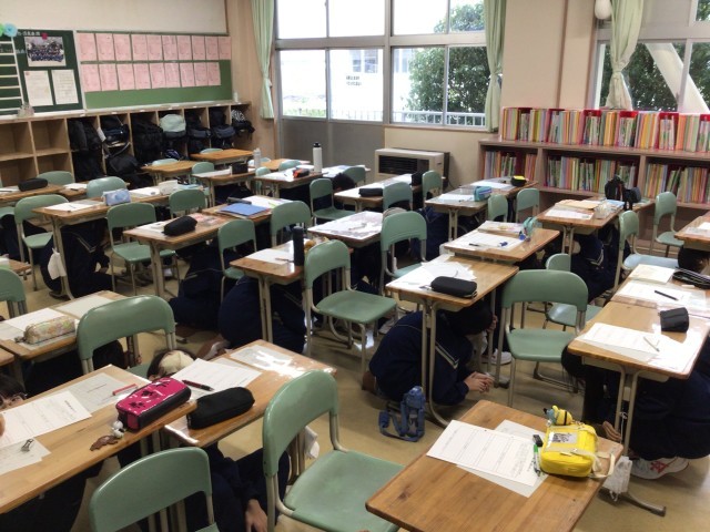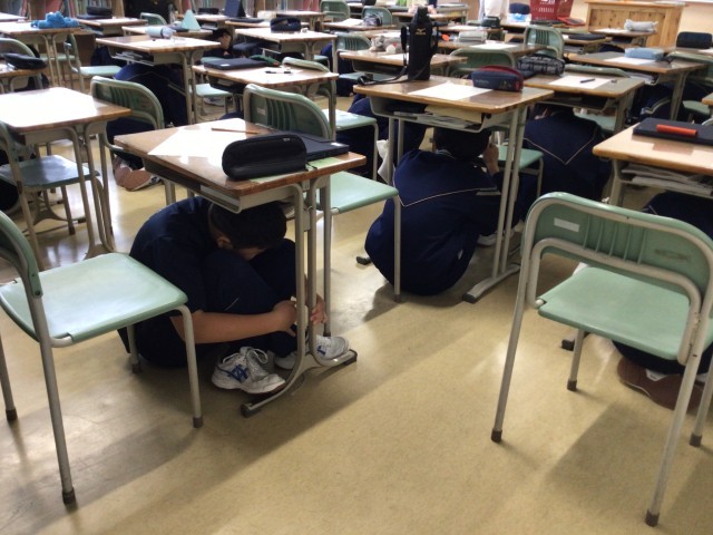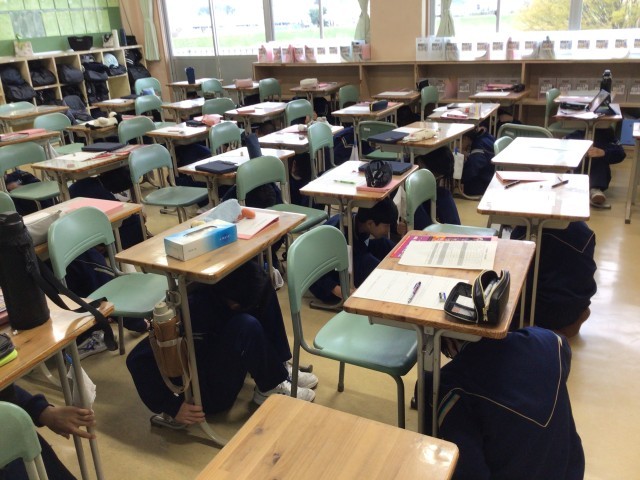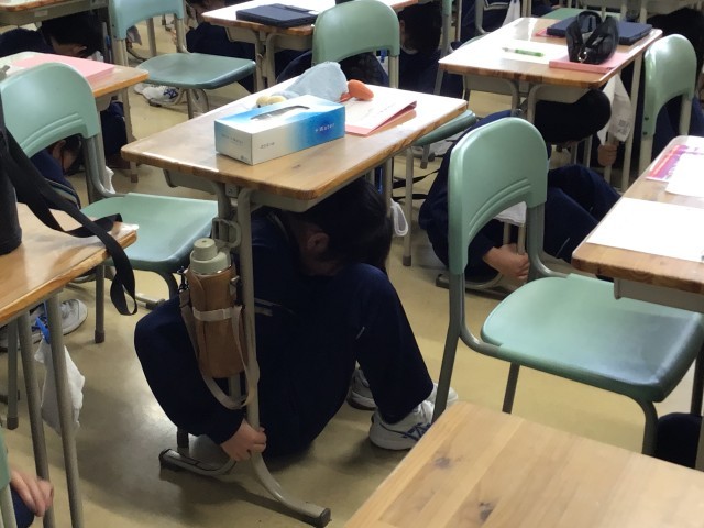 緊急地震速報のアラートを使って、頭を守る行動を訓練です!机の脚をしっかり押さえること!