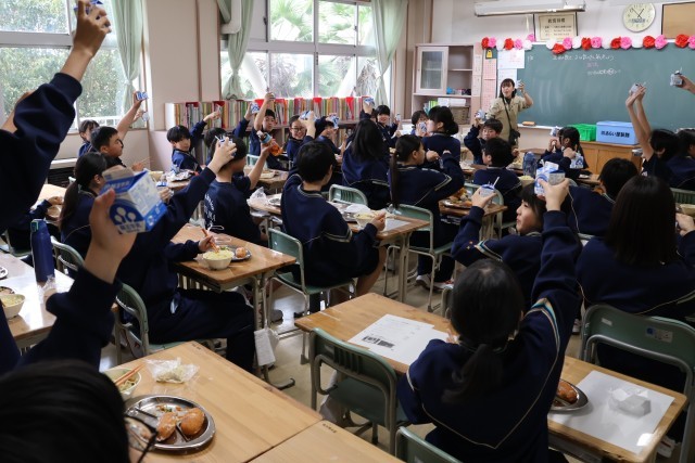 今日が誕生日のクラスメイトがいて、牛乳でカンパイしています。「おめでとー」
