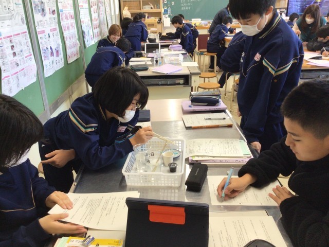 洗剤と水、油と炭にどう反応するか実験です。