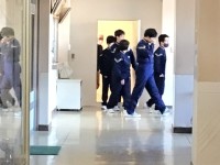 火災を想定して訓練です。防火扉が閉まった状態です。落ち着いて行動できるかな?