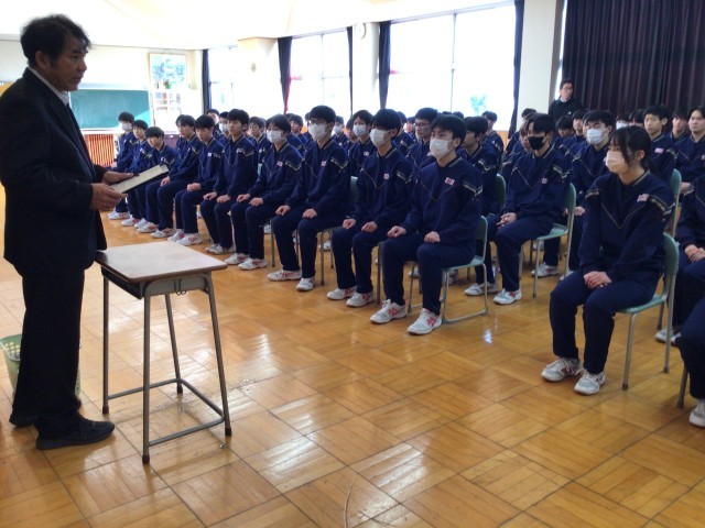 卒業式に向けて学年集会。学年主任のお話。中学校に登校するのも、あと30日!!!