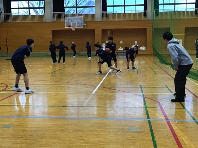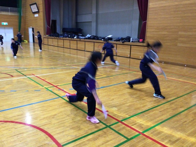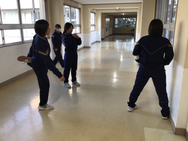 廊下でトレーニング!明日は宮城中で合同練習です。