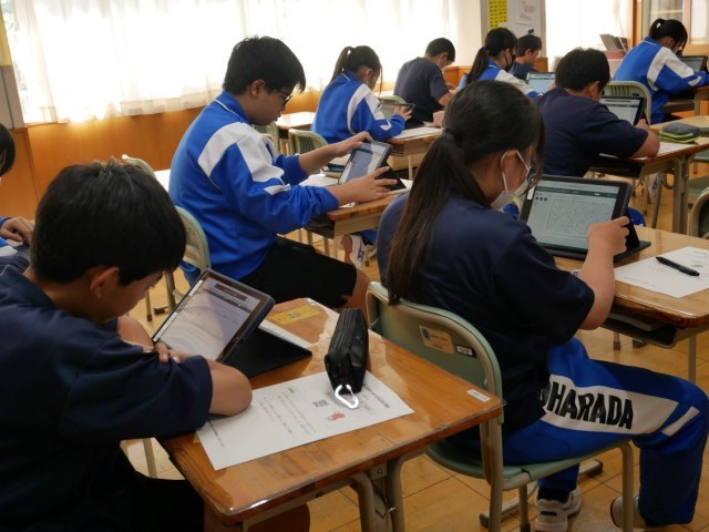 1年生はCBT化対応試行調査という、来年度のふくしま学力調査に向けたタブレットでの練習テストを行いました。操作には特に問題なく取り組むことができました。