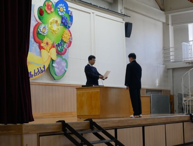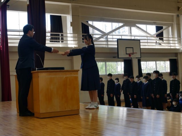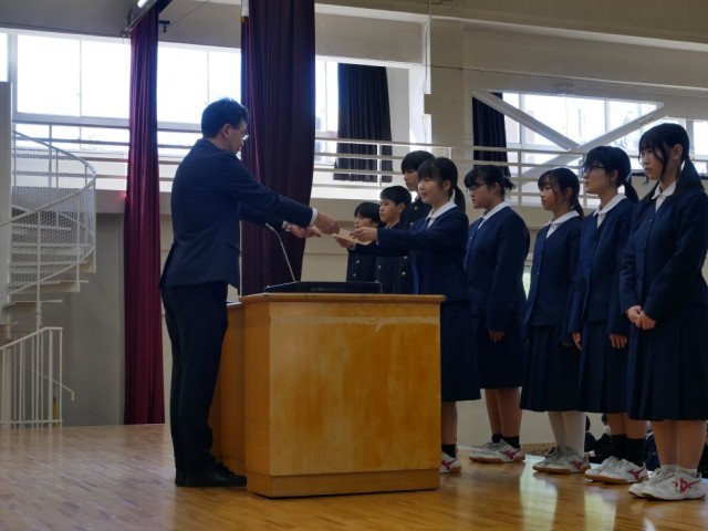 先月選挙により選ばれた生徒会本部役員、2年生が中心となる専門委員長、そして各学級役員それぞれの代表者に任命状が手渡されました。任命式終了後には専門委員会を行い、いよいよ明日から後期の活動がスタートします。一人ひとりが自分の役割を確実に果たすことで、学校生活がより円滑に、より過ごしやすくなることと思いますので、係の仕事に責任をもって取り組むことを期待しています。