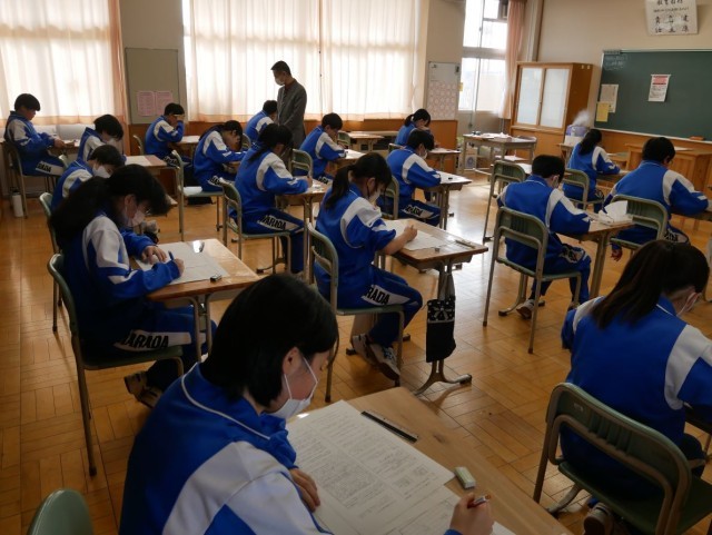 本日、1,2年生の定期テストⅣが行われました。今日は国・数・英・理・社の5教科。明日は実技4教科のテストです。1年間のまとめとなる重要なテストなので、一人一人しっかり学習したことと思います。