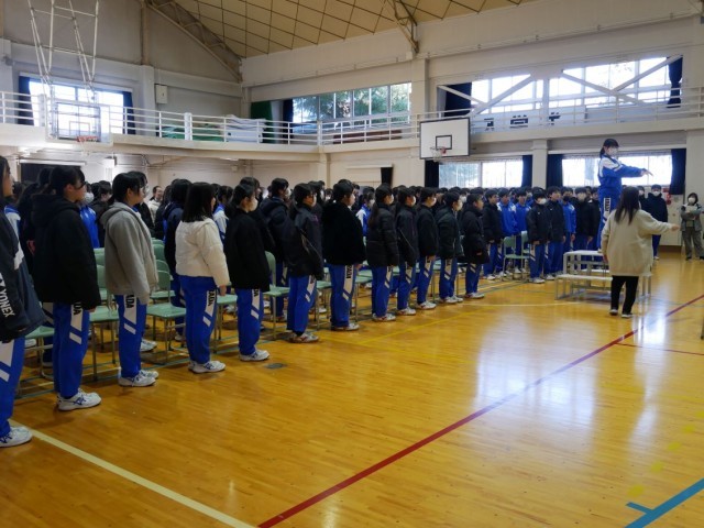 さて、本日6校時目は、全体の卒業式練習を行いました。3年生はもう何度か練習をしていますが、全校生が参加する練習は今日が初めてとなりました。立つ姿勢・座る姿勢・礼の仕方などを3年生がお手本で見せてくれましたが、さすがの態度で拍手が沸きました。