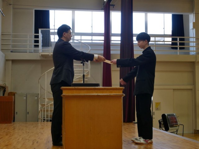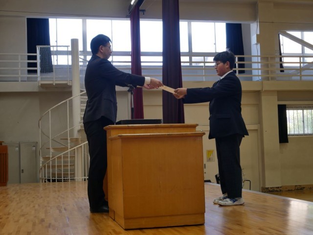 本日、修了式が行われました。1,2年生が、それぞれの学年の課程をすべて修了し、代表者に修了証書が授与されました。新年度からは一つずつ進級し、先輩になります。