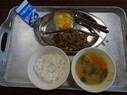 今日は地場産物活用献立として、福島県産黒毛和牛を使った牛丼、きのこけんちん汁、牛乳、白玉団子入りフルーツポンチでした。特に牛丼はとてもおいしくいただくことができました。ごちそうさまでした。
