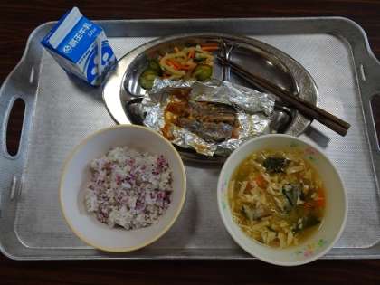 今日のメニューは、赤しそごはん、さんまの味噌ホイル巻き、塩昆布の中華風浅漬け、かき卵汁、牛乳でした。給食には、たくさんの具材が使われていることがわかります。今日もおいしくいただきました。ごちそうさまでした。