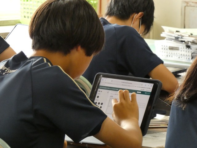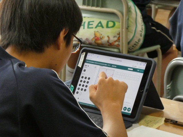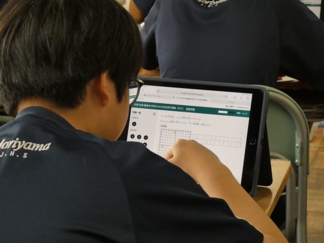 今日は、2年生が「CBT化対応試行調査」を行いました。紙面で行われている全国・県学力調査が、今後オンラインで実施するため、その調査が行われました。普段、タブレットを活用した授業が行われているため、生徒も抵抗なく問題を解いていました。