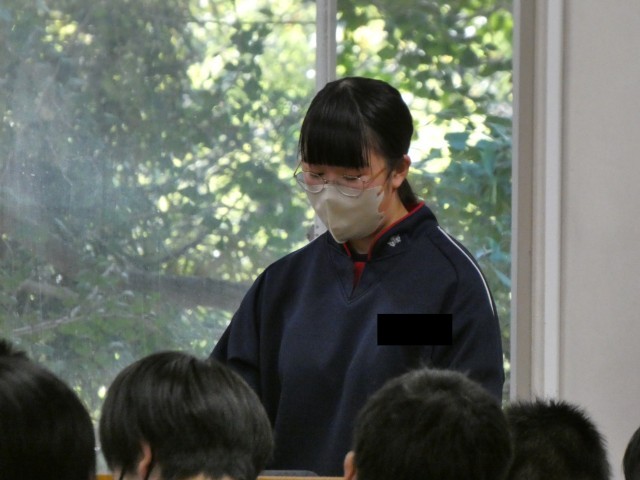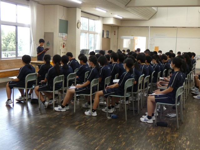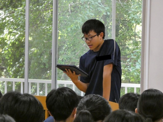 各学年で各クラスの代表者が意見文を発表していました。社会の出来事や課題などに対しての自分の考え・思いをまとめ・発表し、その中から選ばれた生徒が雲水峰祭で発表します。