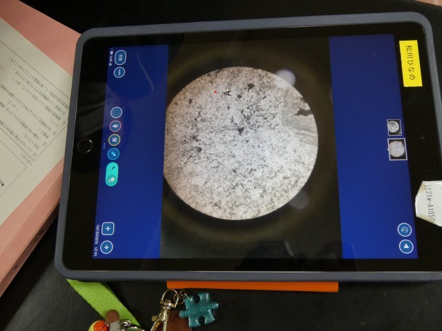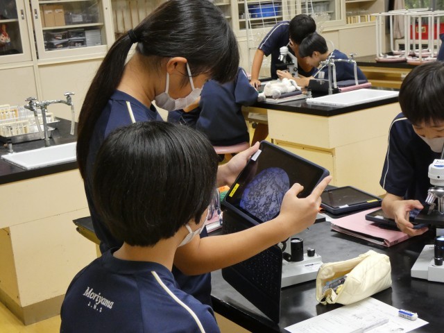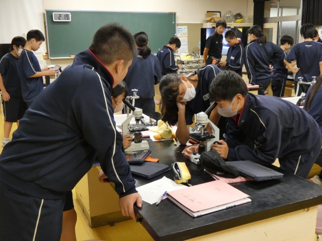 食塩と硝酸カリウムを、水やお湯で溶かしたときの様子や蒸発させたときの結晶を顕微鏡で観察していました。それぞれの物質の結晶を見て、生徒も驚いていた様子です。