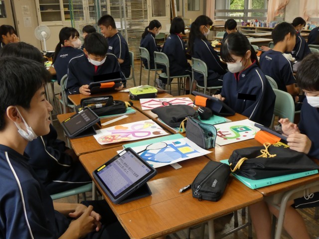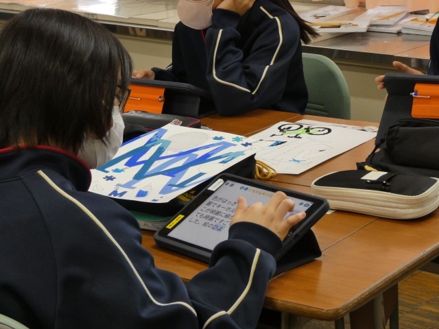イニシャルデザインができあがり、今日はお互いに作品を鑑賞して、よいところをタブレットにまとめていました。色づかい、デザインなど工夫された、すばらしい作品がたくさんありました。