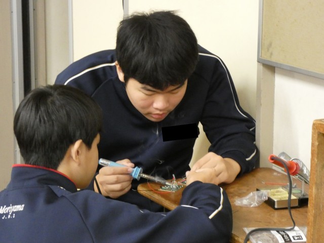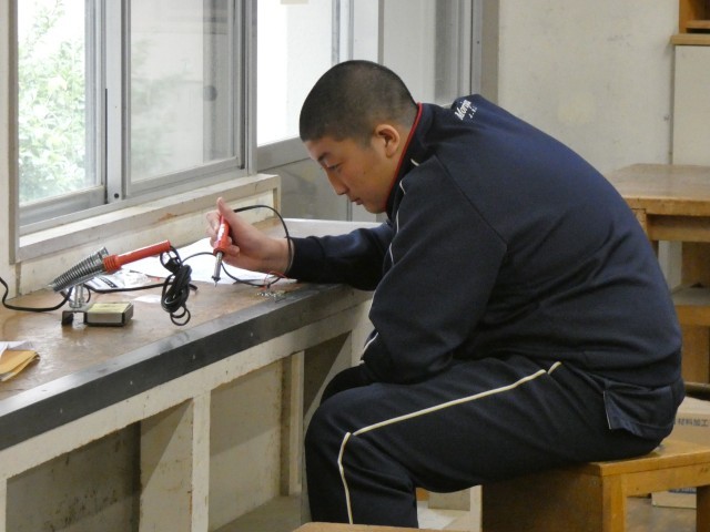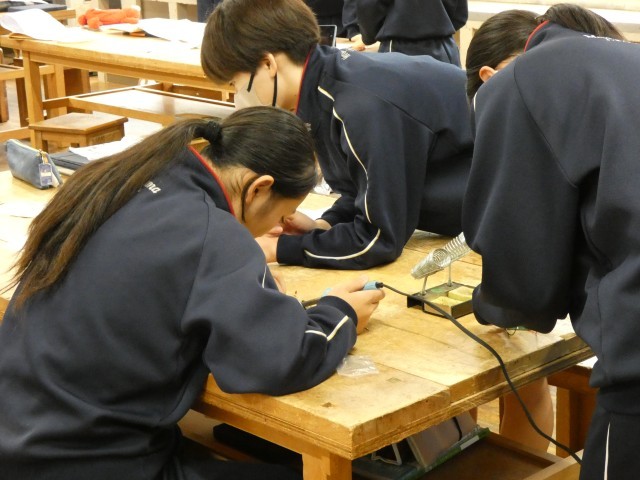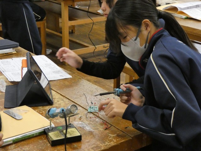 2年技術の授業を覗いて見ました。はんだごてを使って、試行錯誤しながら回路をつくっていました。