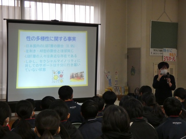 6校時には、講師の先生をお招きし、1年生の思春期講座が行われました。「皆さんの命は、自分だけの命ではなく、今まで受け継がれてきた命であり、皆さんが今度は命を繋いでいく」という話に、生徒も真剣な表情で聞いていました。改めて、命の大切さを感じた時間でした。