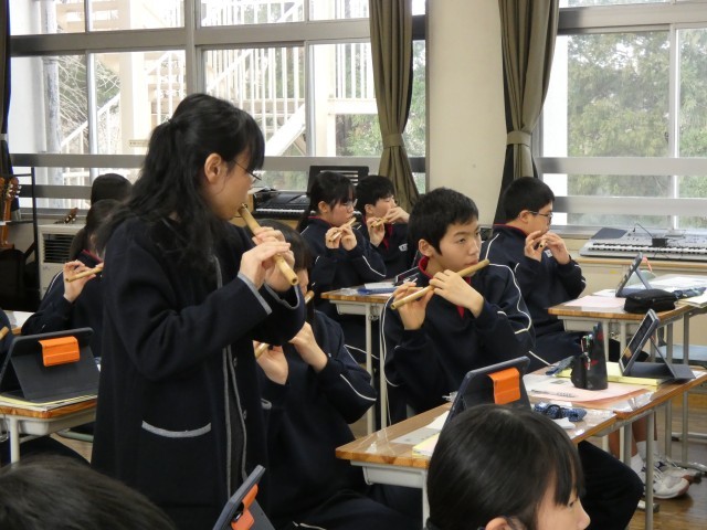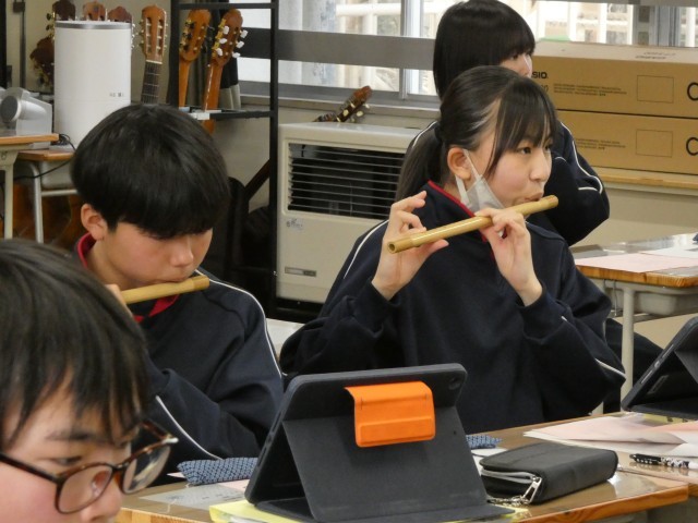 今日は、講師の先生をお招きし、3組で篠笛教室を行いました。田村神社では年3回、神楽の奉納があり、その際の楽器として篠笛が使われています。初めて篠笛を吹く生徒が大半で悪戦苦闘していましたが、笛の音が出たときは大喜びでした。