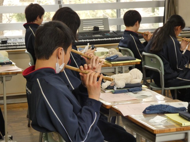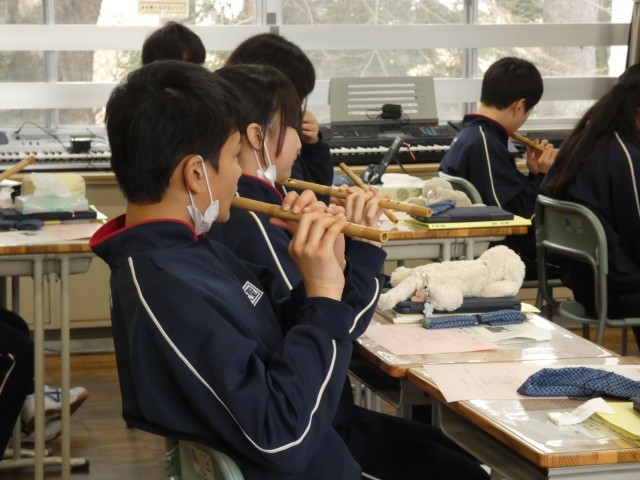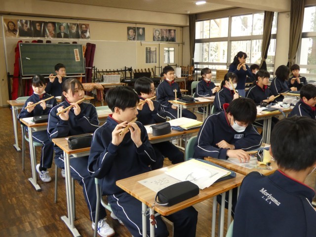 今日は、篠笛教室の最終日。1年2組の授業の様子です。