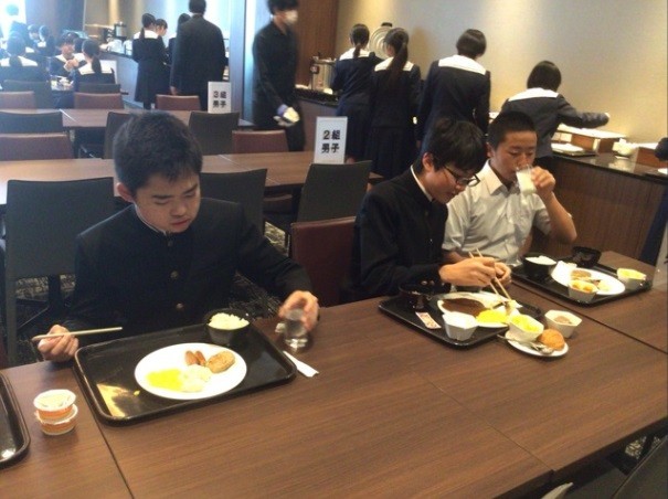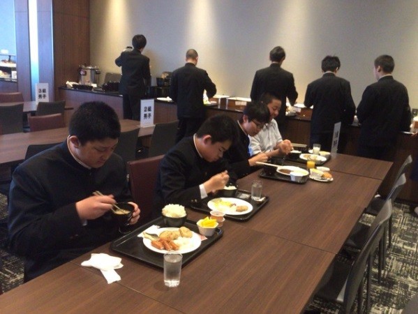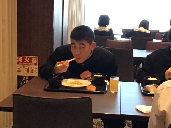 朝食の様子です。おいしく食べています。たくさん食べて2日目も頑張ってください。
