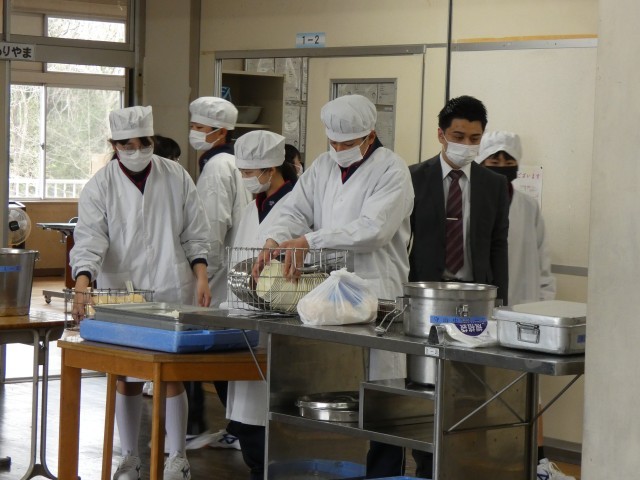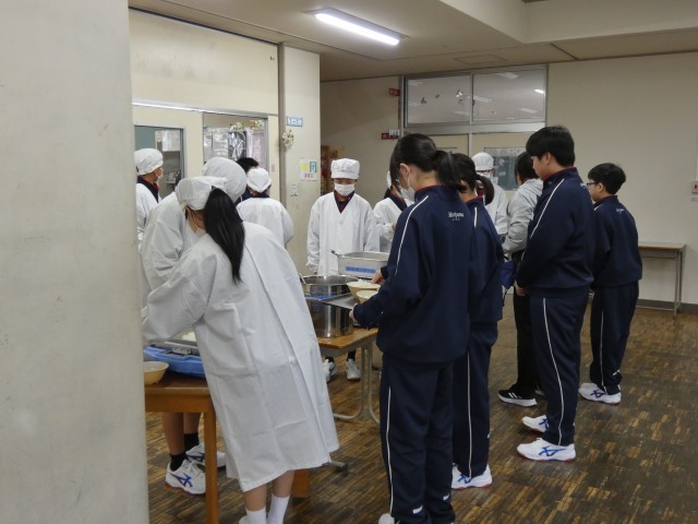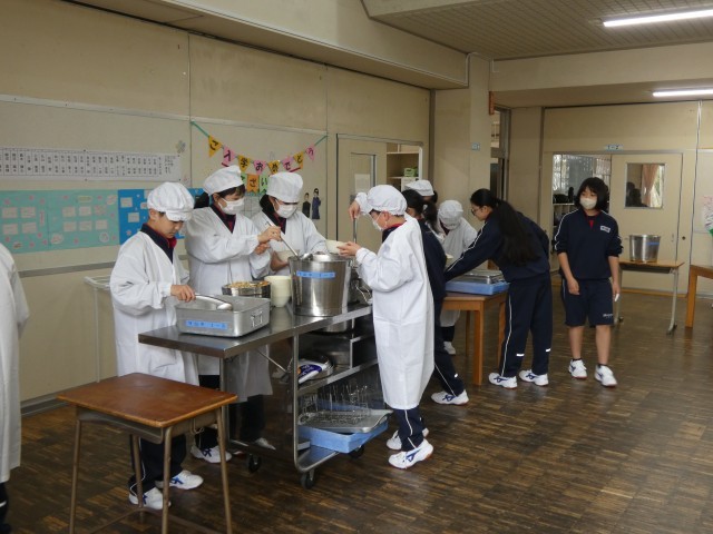 今日から、給食が始まりました。1年生は、中学校で初めての給食です。手際よく準備していました。