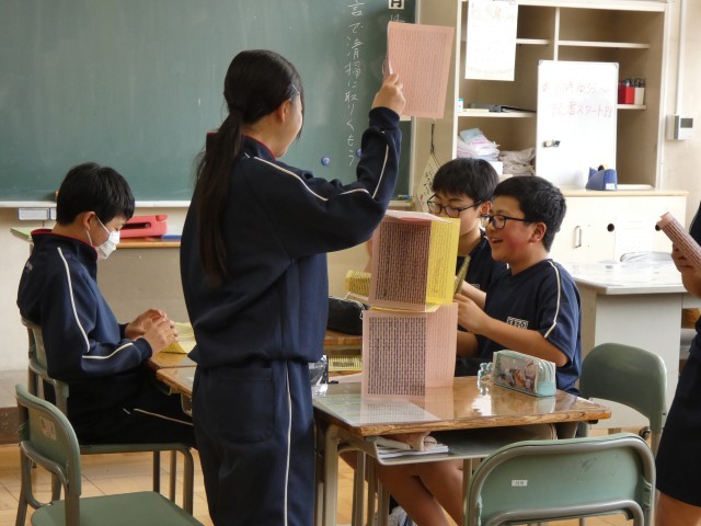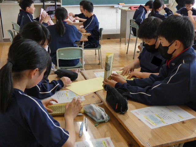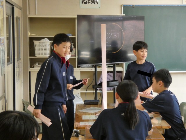 1年3組の学級活動。班員が協力しながら、高いペーパータワーを作っていました。「どのように工夫すれば高くなるのか」班員同士が試行錯誤しながら、活動に取り組んでいました。
