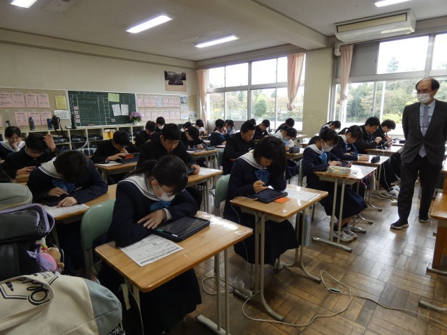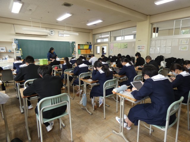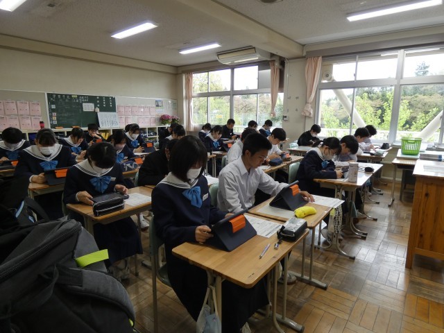 今日から、3年生は、何日かに分けて国語・数学・英語の全国学力・学習状況調査が行われます。今日は英語です。3年生の皆さんは真剣に課題に取り組んでいました。