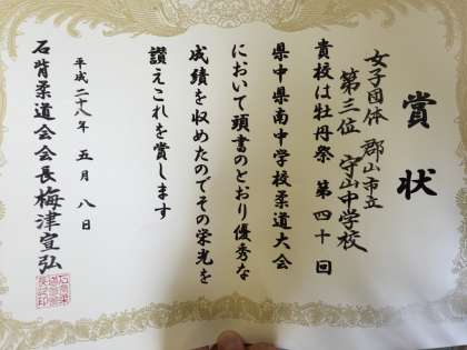 連休中に行われた大会で柔道部女子が見事3位入賞を果たしました。新戦力の1年生も活躍したとのこと。中体連に向けて幸先がよいですね。油断せずにがんばれ!