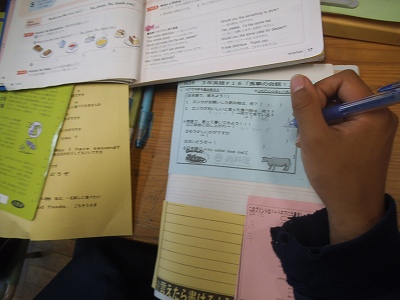 基本文、新出単語、和訳等、学習内容が色分けされ学習カードになっています。ノートに毎時間貼ることで学習の履歴が残り家庭学習に役立ちます。