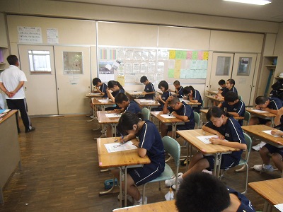 単元テスト中。みんな真剣に取り組んでいました。見直しをしている人、慌てて解答している人、あと2分です〜