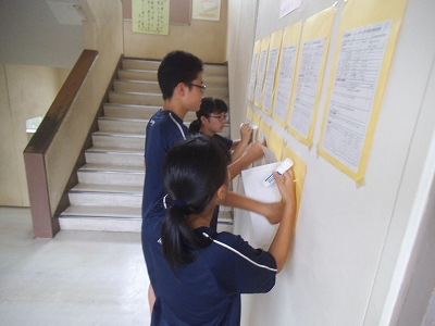 生徒会の皆さん、本日は部休日ですが、居残りでお仕事をしていました。各委員会からのお知らせを掲示していました。明日登校した際に見て下さいね。
