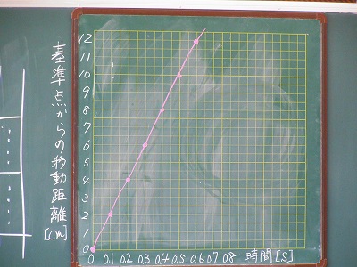 瞬間の速さを記録テープから求めます。打たれた点の間隔から計算するのですが、どこで点を区切るのかが難しい!どこからどこまでで5つ分?あれこれ相談です。