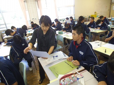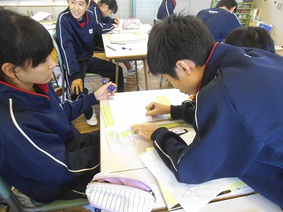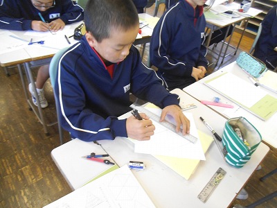定規とコンパスで六角形をつくります。これ、美術の時間。デザインをするのに六角形を基本にするのです。分からないときはお互いに教え合う。男女関係なくお互い聞いて教え合う関係、良いですね。