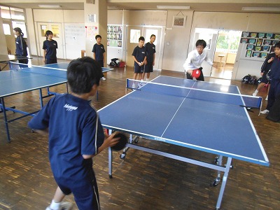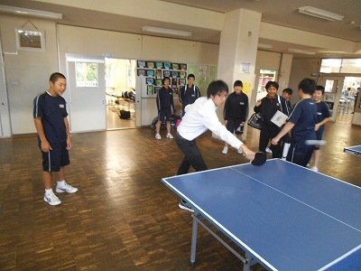 卓球部の1年生。毎日練習しかなり上達しました。通りかかった担任の先生に卓球勝負を挑みました!自信もついてきた頃、得意技で仕留める予定が・・・。担任の先生、なかなかの腕前!思わぬ熱戦にギャラリーが増えてきました!担任恐るべし!