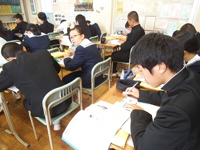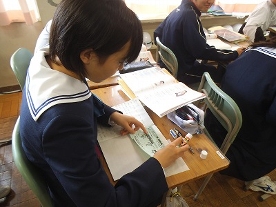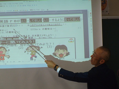ICT機器を活用し視覚的に理解しながら、学習カードをノートに貼ってポイントの確認。書き込みをして自分だけの参考書にします。デジタルとアナログを取り入れて授業をしています。