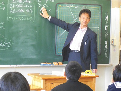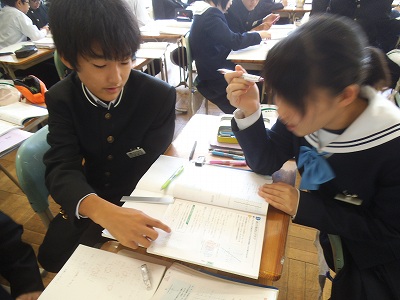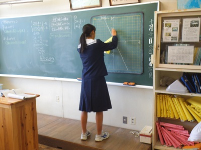 方程式をグラフにします。どうやって傾きを求めればいい?お互いに教え合いながら課題を解決中。