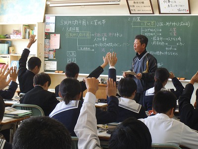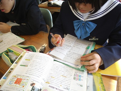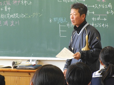 琵琶湖と淀川、関西の水環境を考えるキーワードです。授業のポイントを板書で確認、!ワークシートに書き込みながら要点を整理していました。家でも見直しをしましょうね。